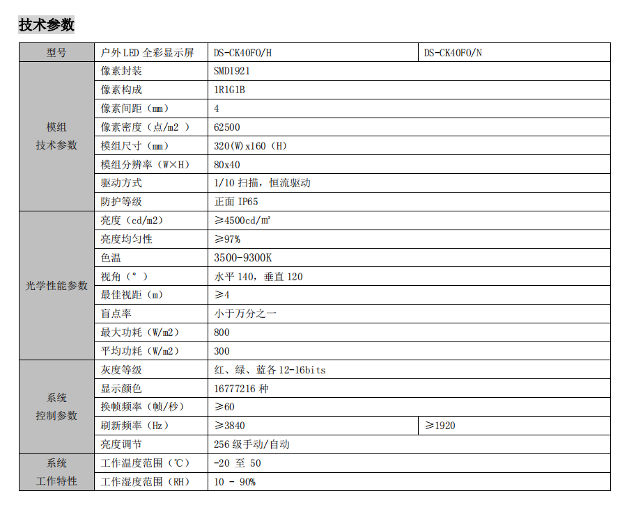 DS-CK40FO 為戶外 LED 全彩顯示屏,點間距為 4mm,可按水平和垂直方向任意拼接,從而實現(xiàn)不同大小的無縫顯示屏。該顯示屏采用恒流方式驅(qū)動 LED,發(fā)光均勻,功耗低,且顯示畫面逼真,視頻流暢,高防護(hù)性,適應(yīng)惡劣戶外環(huán)境,具有空載、短路、過流、過熱等保護(hù)功能。